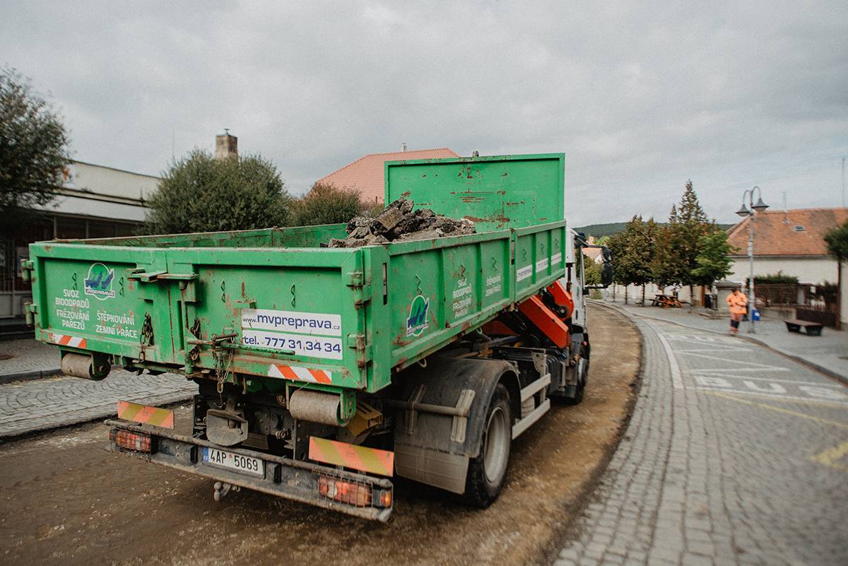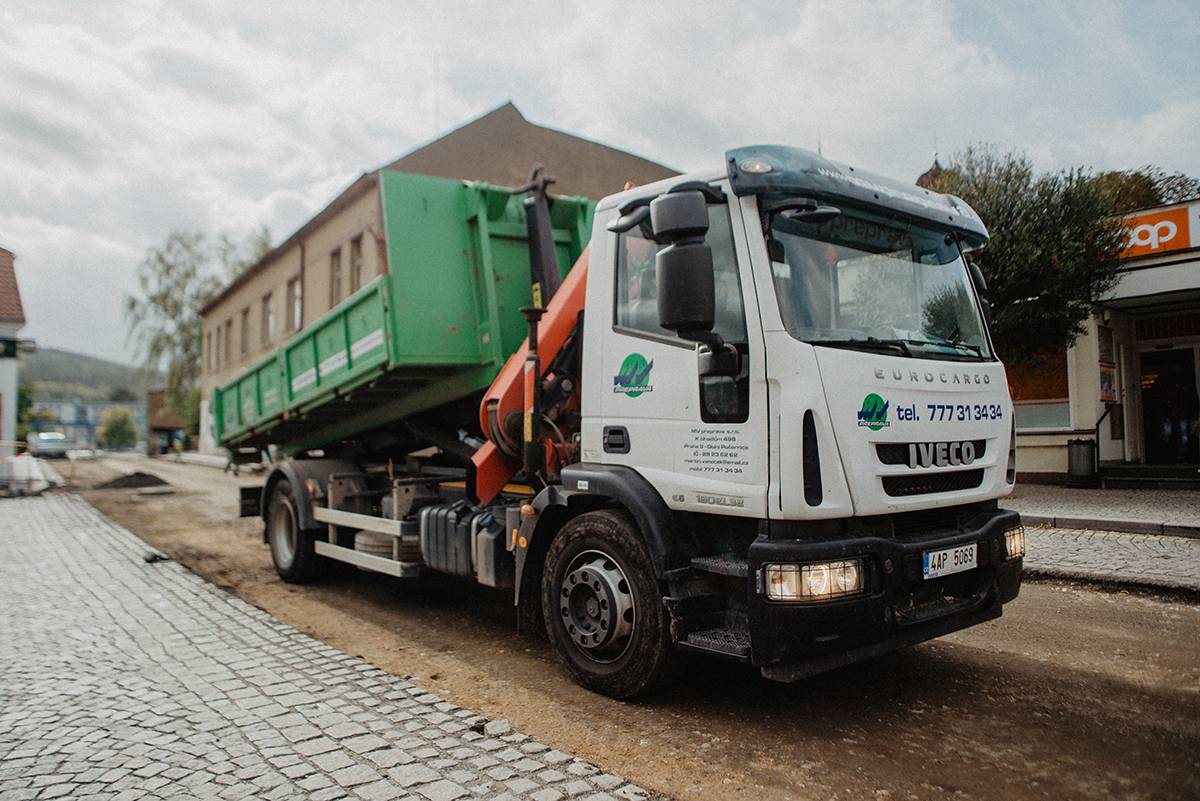 Kompatibilita: Umí nosit kontejnery různých velikostí – hlavně klasické stavební kontejnery na suť, zeminu a odpad.